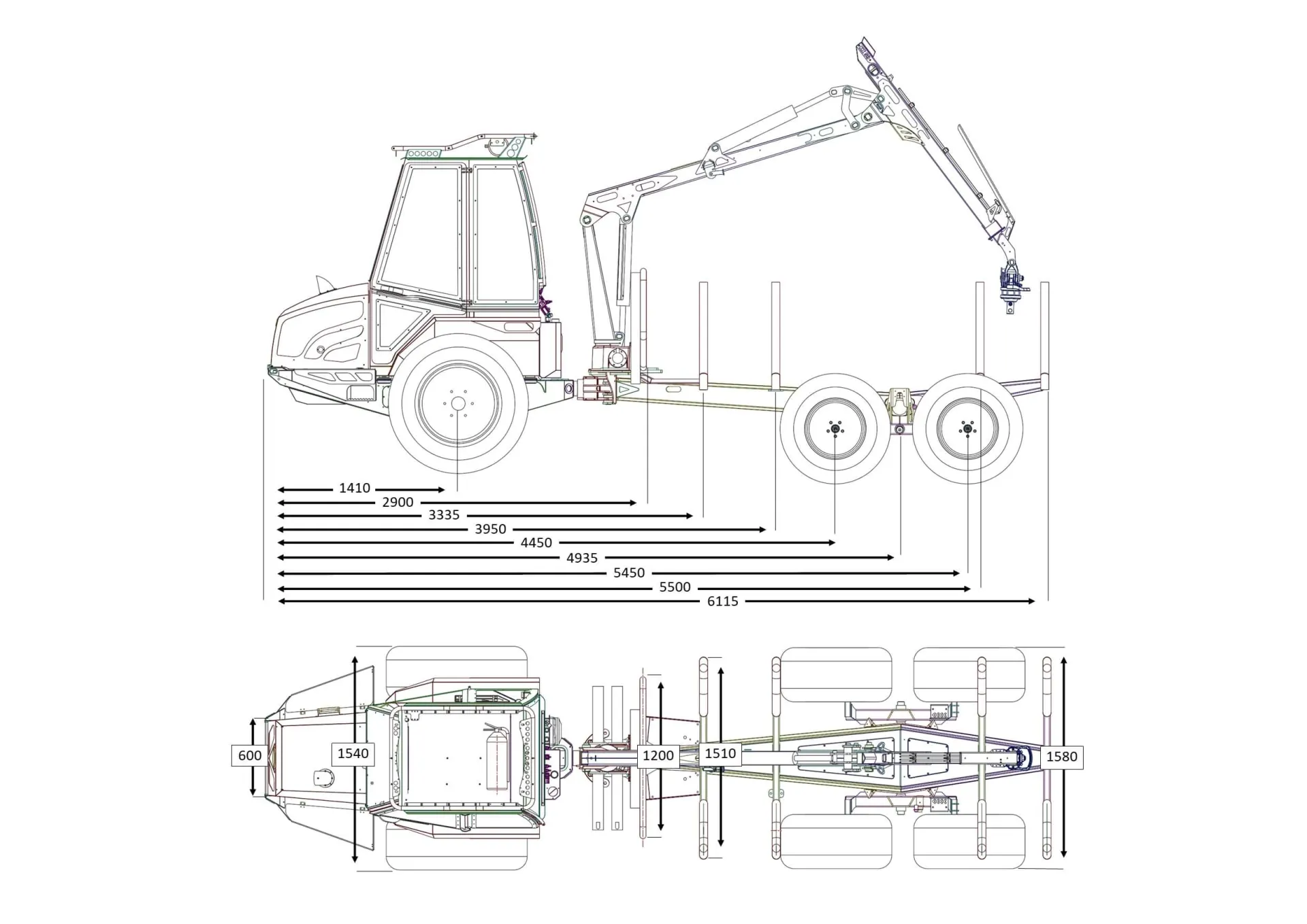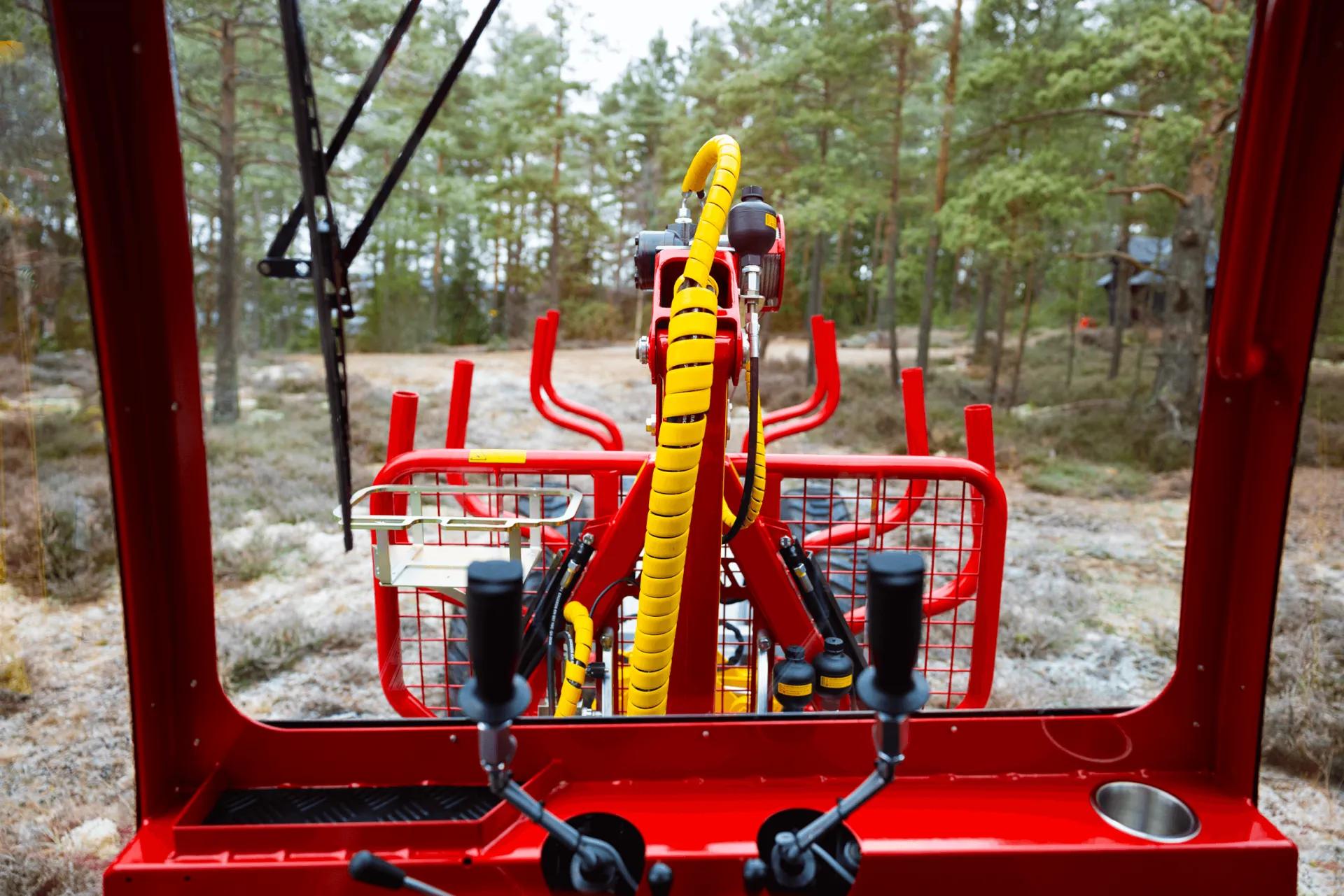 Näkyvyys ja Säilytys: Suuri kaareva ikkuna antaa erinomaisen näkyvyyden. Säilytysratkaisuihin kuuluvat lokero istuimen alla, USB-liitäntä paneelissa sekä pidikkeet moottorisahalle ja yhdistelmäkannulle.