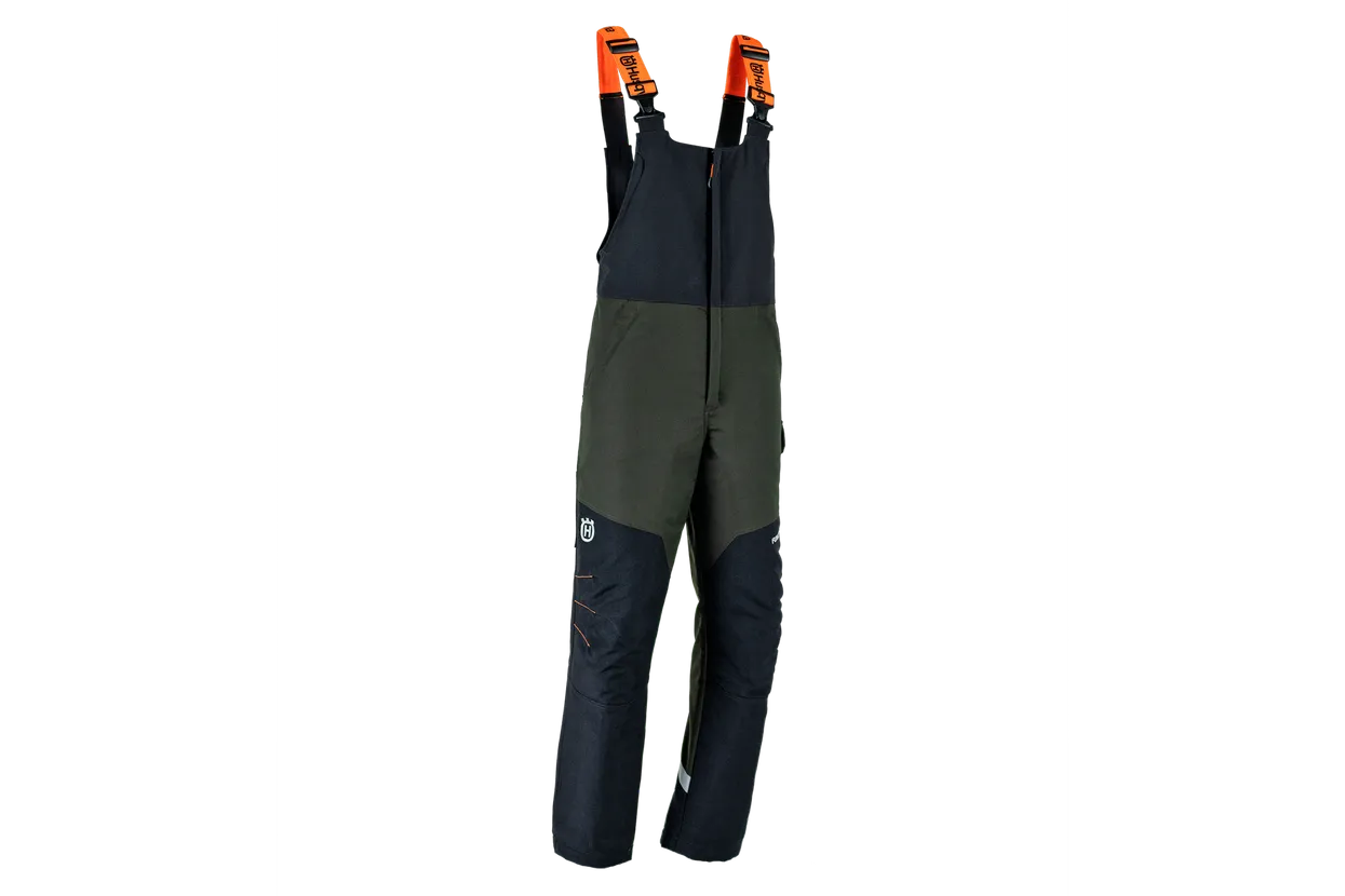 Husqvarna Functional hängselbyxor, utformade i friluftsstil, är perfekta för skogsarbete. Slitstarkt Cordura®-material används på utsatta områden för